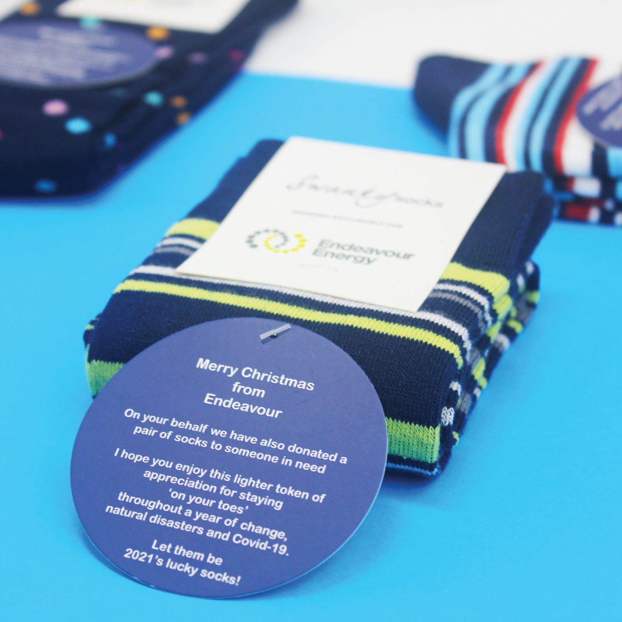 Endeavour Energy was looking for a variety of custom socks that could be given out as a Christmas gift for their staff. Swanky Socks produced a trio of designs inspired by classic Swanky Sock styles and made from our sustainable bamboo blend. Additionally, Endeavour Energy decided to opt into our corporate give back initiative, meaning for every pair of custom socks they purchased, we ensured a pair was donated to someone who needs it most. By choosing our sustainable bamboo blend and opting into our corporate give-back initiative, Endeavour Energy was able to align their custom socks with their values of sustainability, and commitment to community.