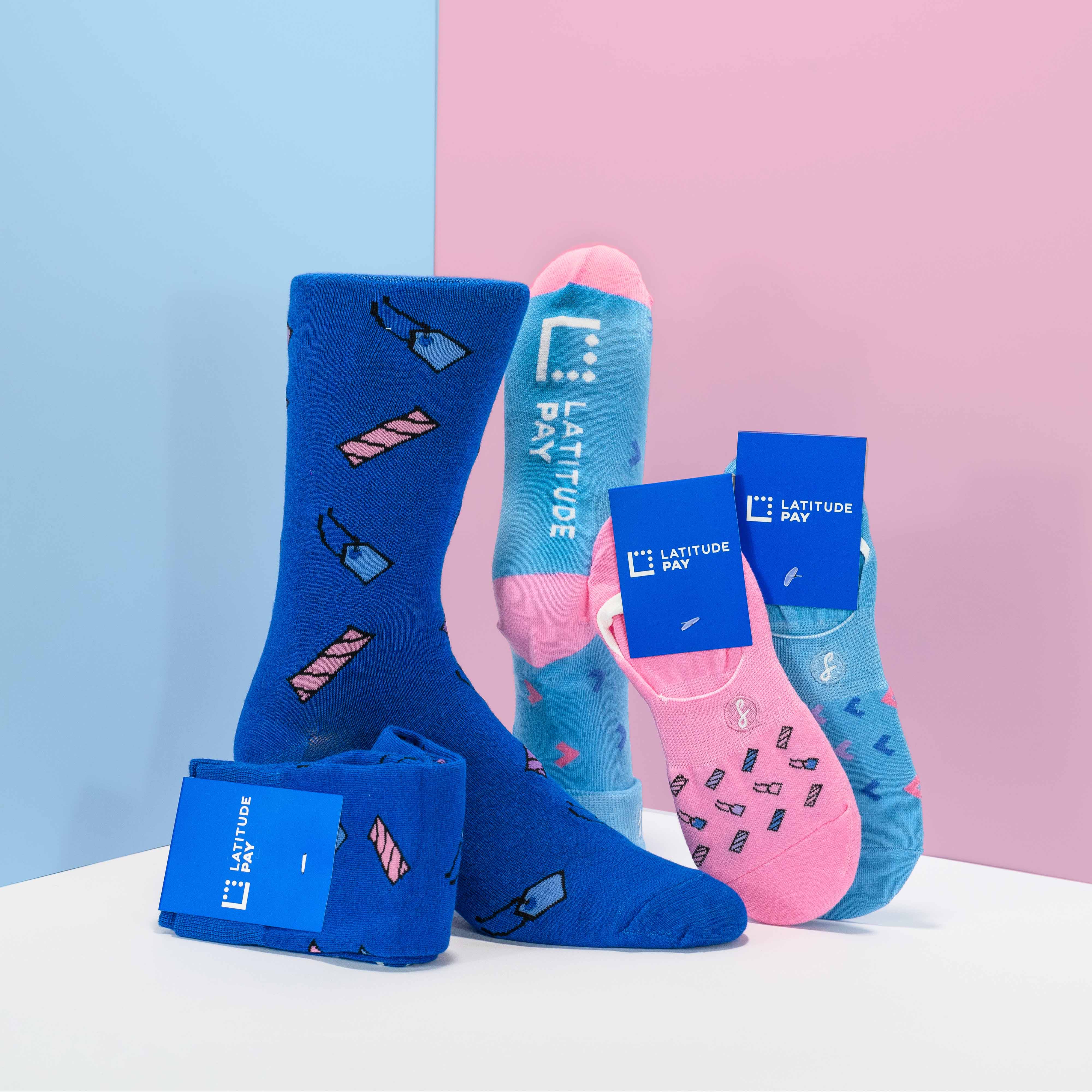Latitude Pay aligned with the Swanky Socks™ custom sock service to design a pair of no show and bamboo dress socks for events and merchandise given to new customers upon sign up. The bright vibrant colours of the sock help create that happy feeling the brand helps to facilitate.