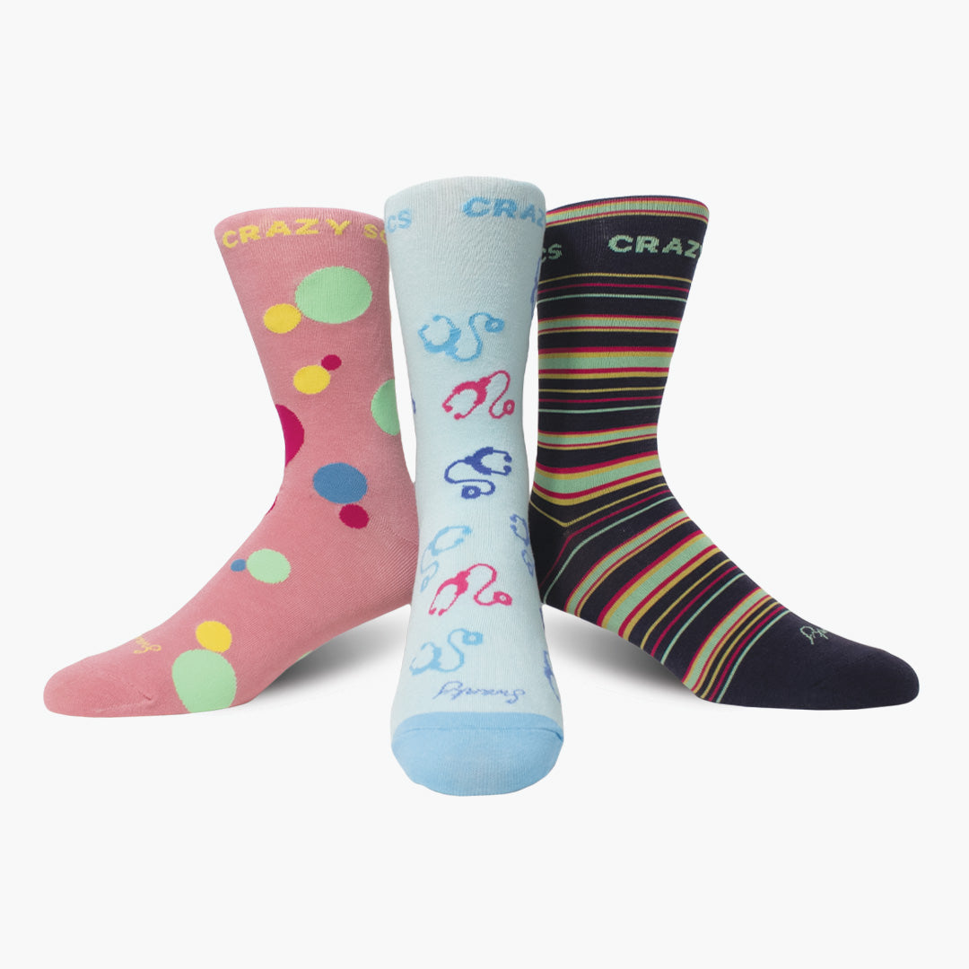 A vibrant trio of purpose-driven socks, designed to start conversations and support the mental health of our healthcare heroes. This exclusive 3-pack includes The Support Stride (striped), The Positivity Spot (polka dot), and The Heartbeat Hero (stethoscope motif) — each created in proud partnership with the official Crazy Socks 4 Docs campaign.